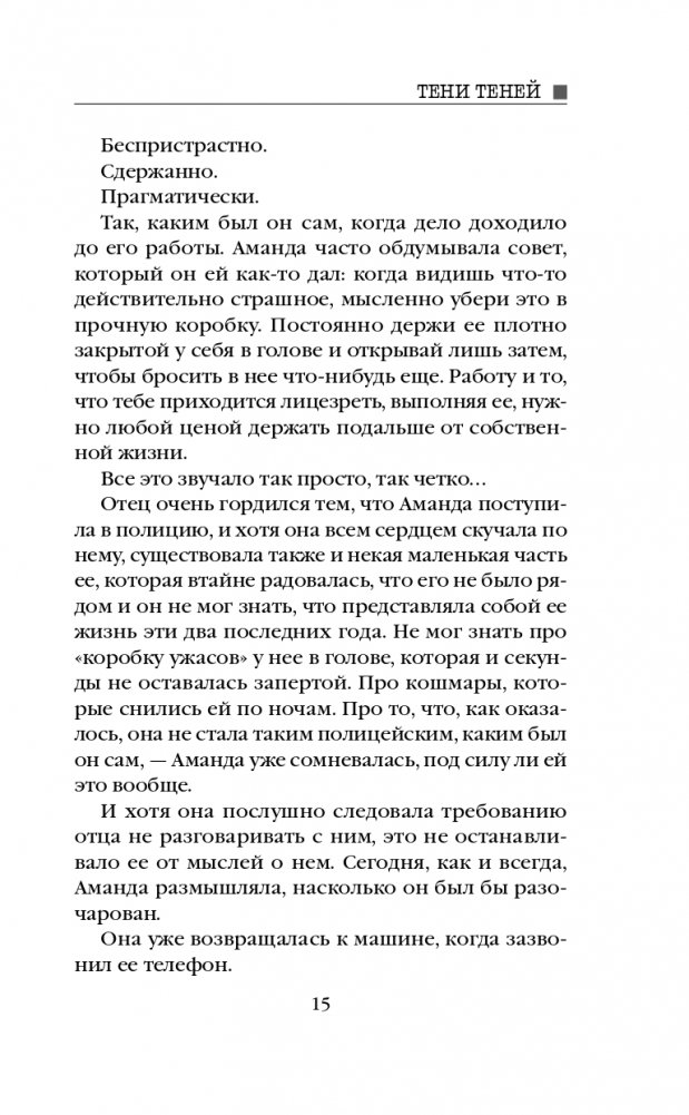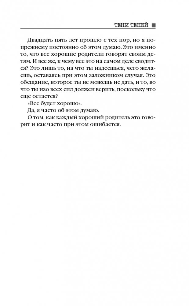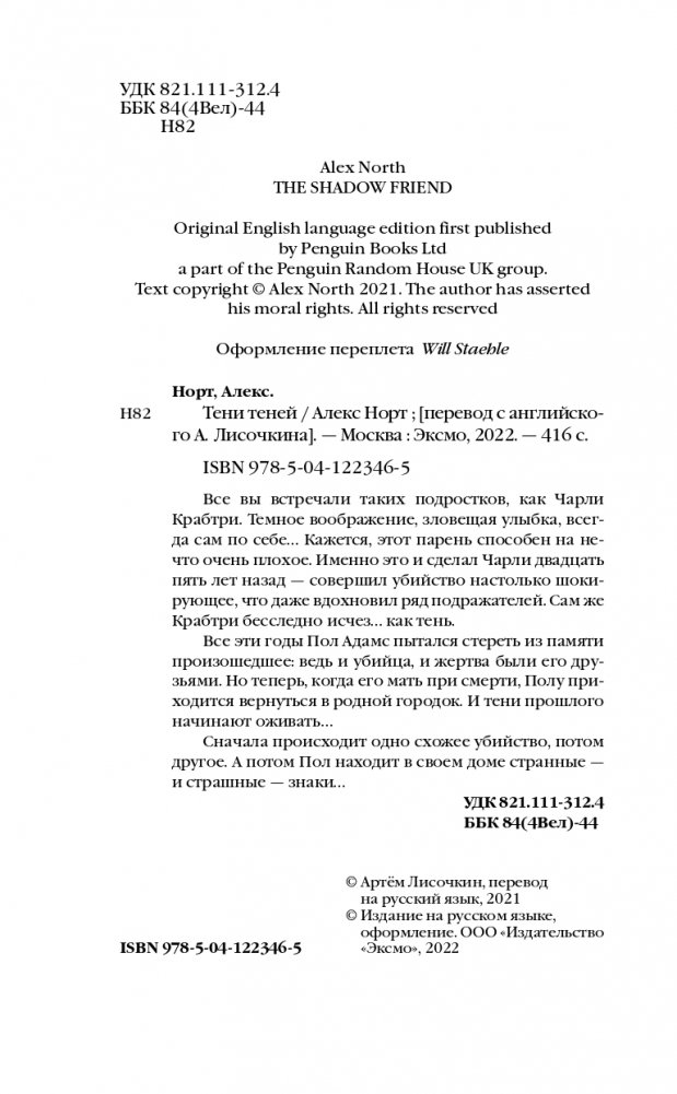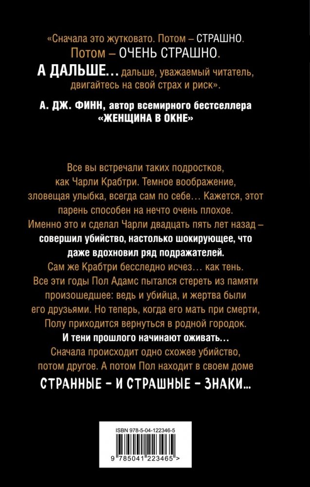 Все вы встречали таких подростков, как Чарли Крабтри. Темное воображение, зловещая улыбка, всегда сам по себе… Кажется, этот парень способен на нечто очень плохое. Именно это и сделал Чарли двадцать пять лет назад – совершил убийство, настолько шокирующее, что даже вдохновил ряд подражателей. Сам же Крабтри бесследно исчез… как тень. Все эти годы Пол Адамс пытался стереть из памяти произошедшее: ведь и убийца, и жертва были его друзьями. Но теперь, когда его мать при смерти, Полу приходится вернуться в родной городок. И тени прошлого начинают оживать… Сначала происходит одно схожее убийство, потом другое. А потом Пол находит в своем доме странные – и страшные – знаки…