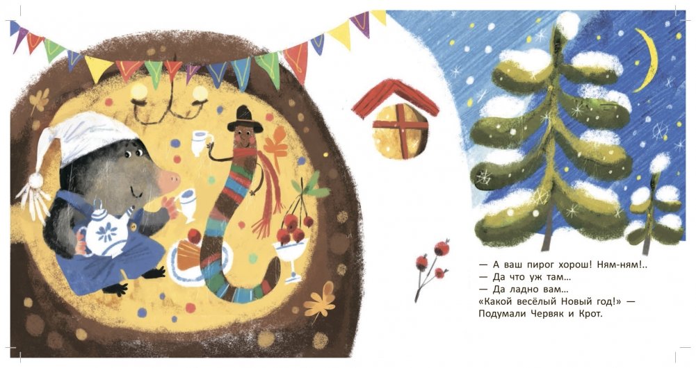 Благодаря рисункам Ирины Гавриловой история о Кроте и Червяке становится осязаемой. Открывая книгу, читатель будто открывает дверь в норку крота и может не только увидеть, но и почувствовать все что там происходит. Ребенку понравится разглядывать новогоднее убранство в жилище крота, различные маленькие детали: флажки, гирлянды из веточек рябины, разноцветный вязаный коврик, граммофон, банки с вареньем и конечно нарядную ёлку.