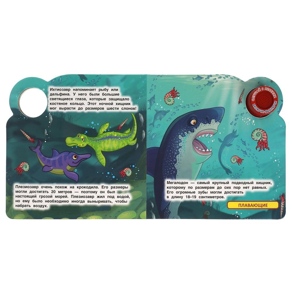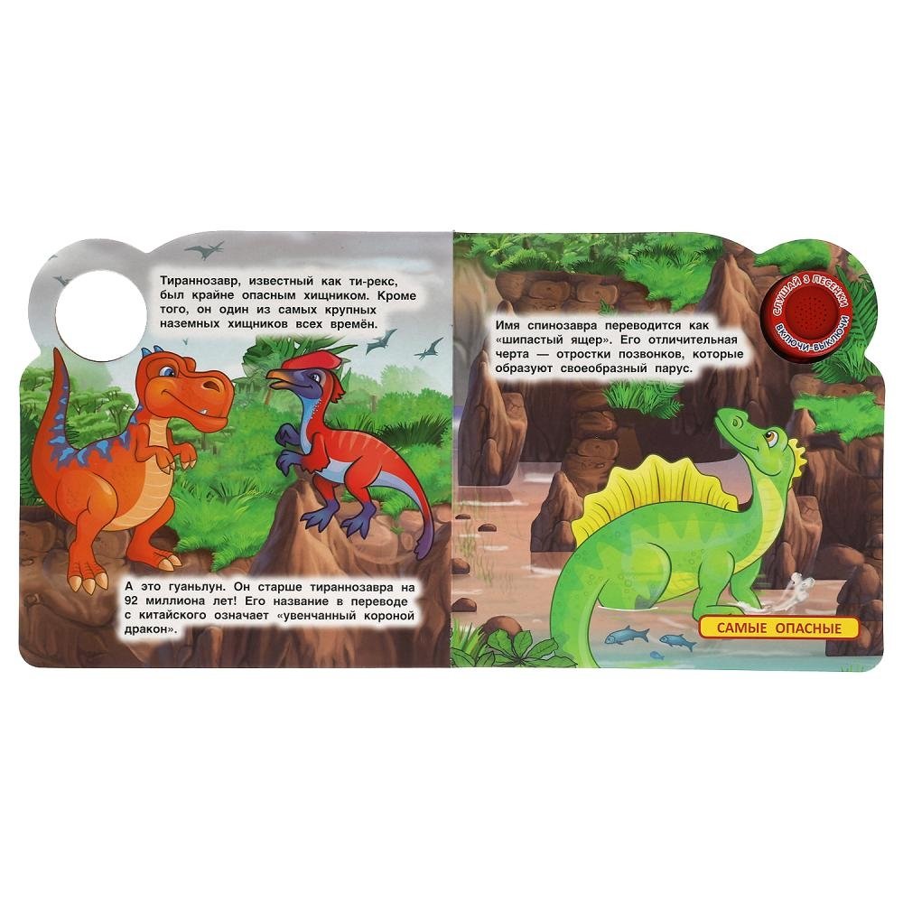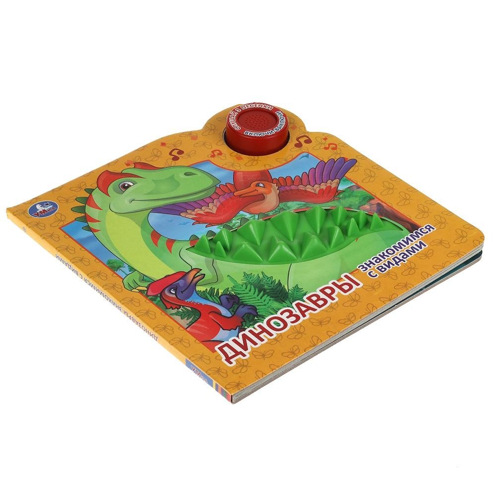 Ребёнок с удовольствием будет листать плотные картонные страницы, рассматривать красочные картинки, читать интересные факты о разнообразных динозаврах, а также нажимать на кнопку и слушать весёлые песенки. Для привлечения большего внимания малыша к книге и развития его сенсорики на обложке имеется элемент из приятного на ощупь силикона. Благодаря компактному формату книгу удобно брать с собой в дорогу.