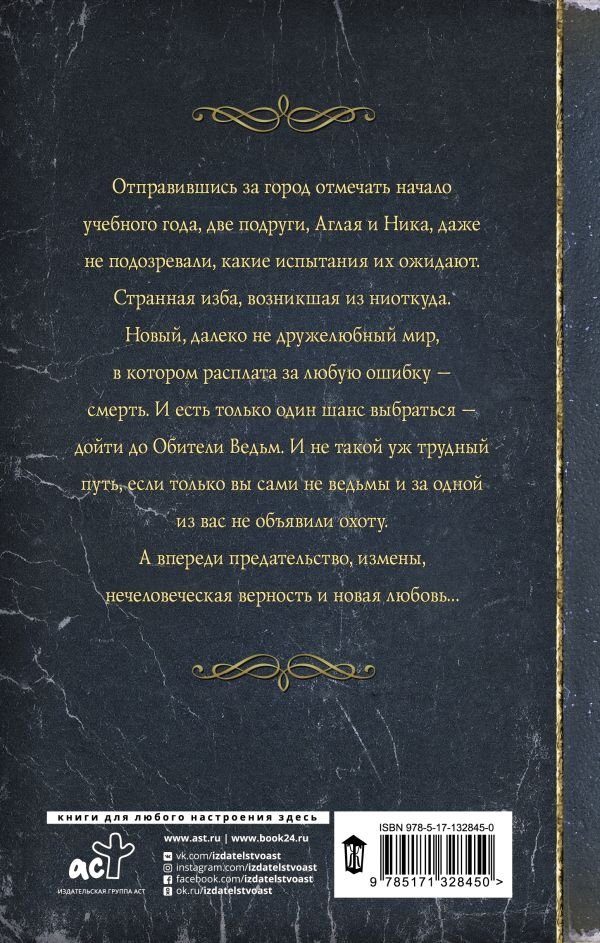 Отправившись за город отмечать начало учебного года, две подруги, Аглая и Ника, даже не подозревали, какие испытания их ожидают. Странная изба, возникшая из ниоткуда. Новый, далеко не дружелюбный мир, в котором расплата за любую ошибку - смерть. И есть только один шанс выбраться - дойти до Обители Ведьм. И не такой уж трудный путь, если только вы сами не ведьмы и за одной из вас не объявили охоту. А впереди предательство, измены, нечеловеческая верность и новая любовь...