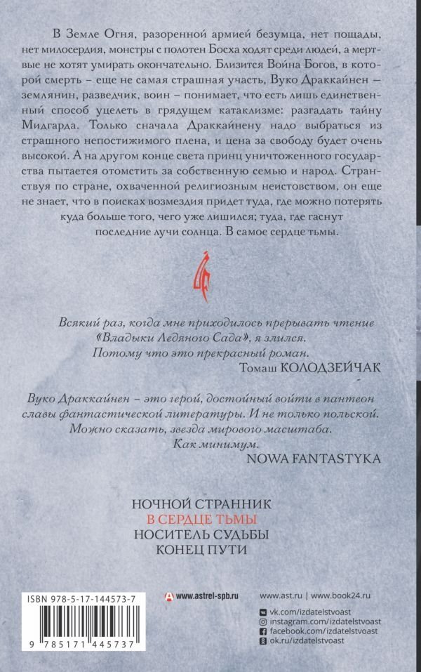 В Земле Огня, разоренной армией безумца, нет пощады, нет милосердия, монстры с полотен Босха ходят среди людей, а мертвые не хотят умирать окончательно. Близится Вой на богов, в которой смерть — еще не самая страшная участь, Вуко Драккайнен — землянин, разведчик, воин — понимает, что есть лишь единственный способ уцелеть в грядущем катаклизме: разгадать тайну Мидгарда. Только сначала ему надо выбраться из страшной непостижимой западни, и цена за свободу будет очень высокой. А на другом конце света принц уничтоженного государства пытается отомстить за собственную семью и народ. Странствуя по стране, охваченной религиозным неистовством, он еще не знает, что в поисках возмездия придет туда, где можно потерять куда больше того, чего уже лишился; туда, где гаснут последние лучи солнца. В самое сердце тьмы.