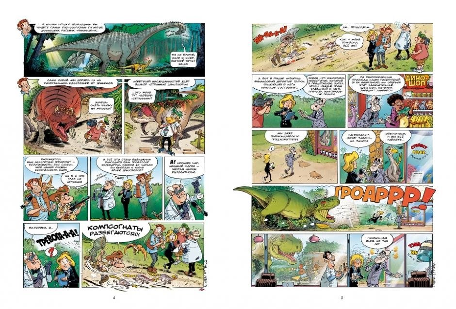 Свершилось! Гениальному доктору Фалькариусу удалось то, о чём все так долго мечтали, — воскресить динозавров! Но как? Он сам с удовольствием об этом расскажет на страницах нового комикса французских авторов Арно Плюмери и Блоза (уже знакомых нам по серии «Динозавры в комиксах») под названием «Дино-парк». Не только расскажет, но и покажет: территория парка достаточно обширна для того, чтобы представить все основные группы динозавров, будь то травоядные гиганты (диплодоки, брахиозавры, мамэньсизавры), вечно голодные хищники всех размеров (велоцирапторы, компсогнаты, дилофозавры), бронированные анкилозавры («танки на лапах», по меткому выражению стажёра Кевина) или увенчанные внушительными рогами трицератопсы и их многочисленная родня (космоцератопсы, стиракозавры, хасмозавры). Ну а если вам хочется увидеть нечто и вовсе диковинное — добро пожаловать в вольер «странных динозавров», где вас с нетерпением ждут конкавенатор, теризинозавр, пегомастакс и пахицефалозавр! Но кто же главная звезда Дино-парка — угадайте!