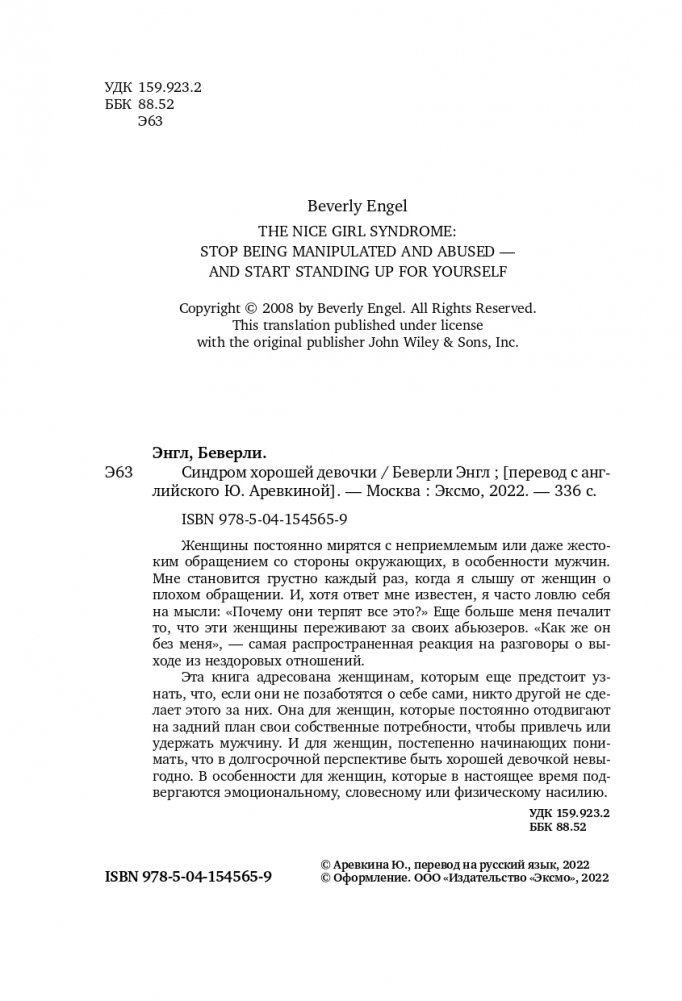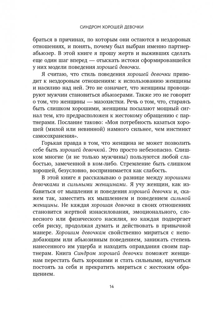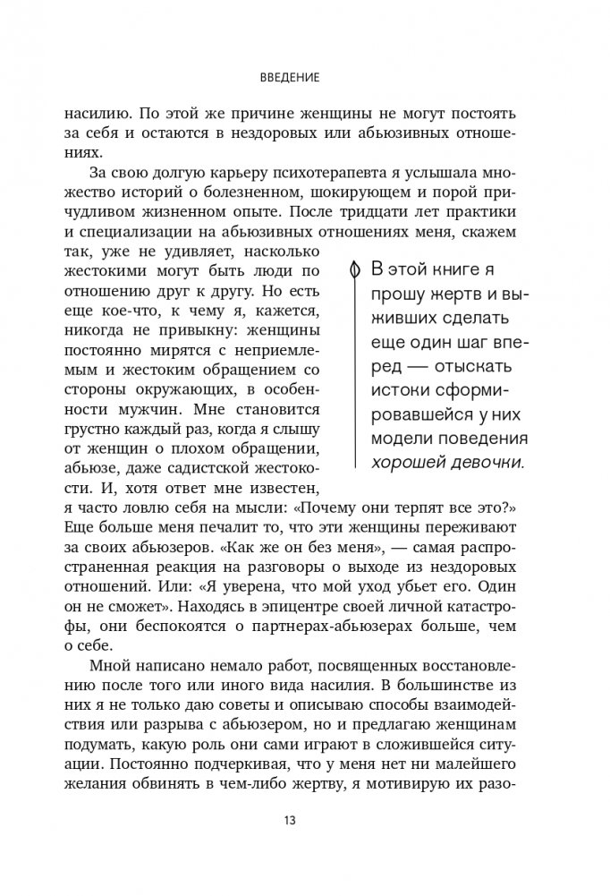 Женщины постоянно мирятся с неприемлемым или даже жестоким обращением со стороны окружающих, в особенности мужчин. Мне становится грустно каждый раз, когда я слышу от женщин о плохом обращении. И, хотя ответ мне известен, я часто ловлю себя на мысли: "Почему они терпят все это?". Еще больше меня печалит то, что эти женщины переживают за своих абьюзеров. "Как же он без меня", — самая распространенная реакция на разговоры о выходе из нездоровых отношений. Эта книга адресована женщинам, которым еще предстоит узнать, что, если они не позаботятся о себе сами, никто другой не сделает этого за них. Она для женщин, которые постоянно отодвигают на задний план свои собственные потребности, чтобы привлечь или удержать мужчину. И для женщин, постепенно начинающих понимать, что в долгосрочной перспективе быть хорошей девочкой невыгодно. В особенности для женщин, которые в настоящее время подвергаются эмоциональному, словесному или физическому насилию.