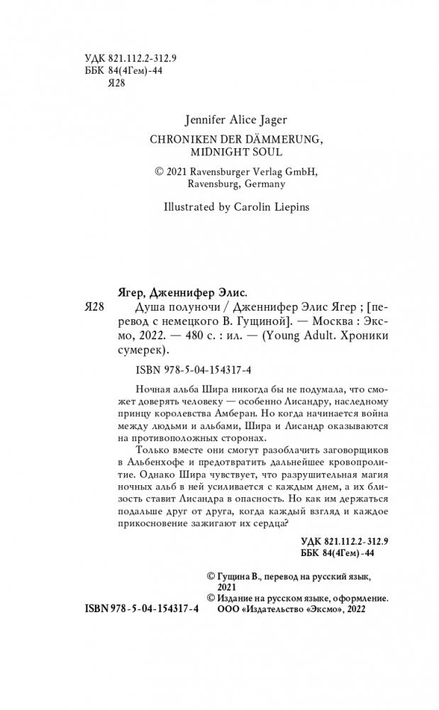 Ночная альба Шира никогда бы не подумала, что сможет доверять человеку — особенно Лисандру, наследному принцу королевства Амберан. Но когда начинается война между людьми и альбами, Шира и Лисандр оказываются на противоположных сторонах. Только вместе они смогут разоблачить заговорщиков в Альбенхофе и предотвратить дальнейшее кровопролитие. Однако Шира чувствует, что разрушительная магия ночных альб в ней усиливается с каждым днем, а их близость ставит Лисандра в опасность. Но как им держаться подальше друг от друга, когда каждый взгляд и каждое прикосновение зажигают их сердца?