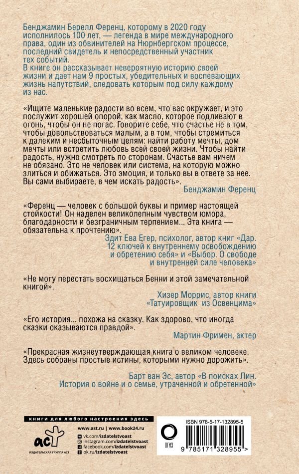Бенджамин Берелл Ференц, которому в 2020 году исполнилось 100 лет, — легенда в мире международного права, один из обвинителей на Нюренбергском процессе, последний свидетель и непосредственный участник тех событий. В книге он рассказывает невероятную историю своей жизни, и дает нам 9 простых, убедительных и воспевающих жизнь напутствий, следовать которым под силу каждому из нас.