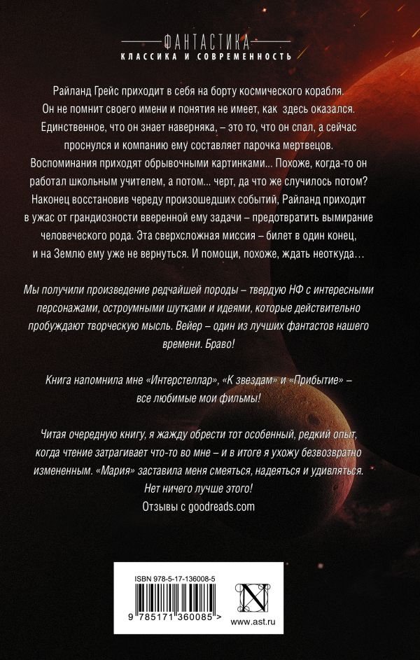 Райланд Грейс приходит в себя на борту космического корабля. Он не помнит своего имени и понятия не имеет, как здесь оказался. Единственное, что он знает наверняка, это то, что он спал, а сейчас проснулся и компанию ему составляет парочка мертвецов. Воспоминания приходят обрывочными картинками... Похоже, когда-то он работал школьным учителем, а потом... черт, да что же случилось потом?