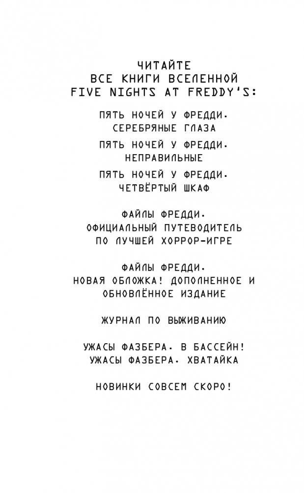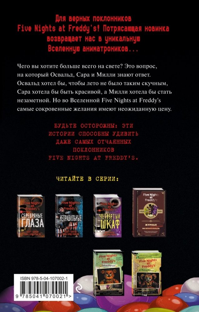 Чего вы хотите больше всего на свете? Это вопрос, на который Освальд, Сара и Милли знают ответ. Освальд хотел бы, чтобы лето не было таким скучным, Сара хотела бы быть красивой, а Милли хотела бы стать незаметной. Но во Вселенной Five Nights at Freddy's самые сокровенные желания имеют неожиданную цену...