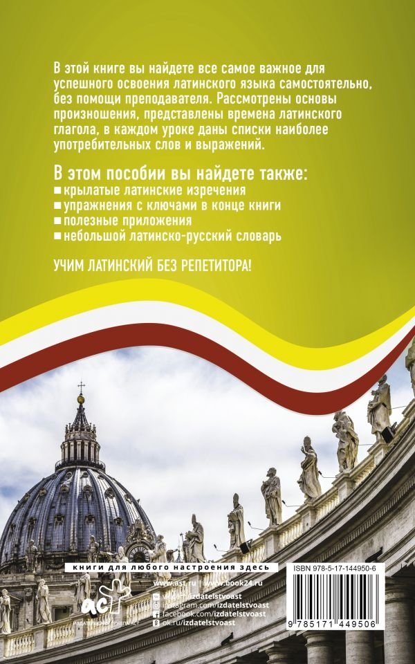 Данный самоучитель поможет читателям самостоятельно без помощи преподавателя овладеть азами латинского языка. В этой книге вы найдете правила чтения и произношения, самые нужные грамматические темы, а также узнаете основные латинские времена. Материал в пособии изложен максимально понятно и доступно, хорошо запоминается благодаря большому количеству примеров с широкоупотребительной лексикой. К каждому уроку дается словарик с новыми и полезными словами, также приводятся крылатые латинские изречения. Для успешного закрепления пройденной темы даны упражнения, ключи к которым помещены в конце книги. Вы также можете воспользоваться полезными приложениями и латинско-русским словарем.
