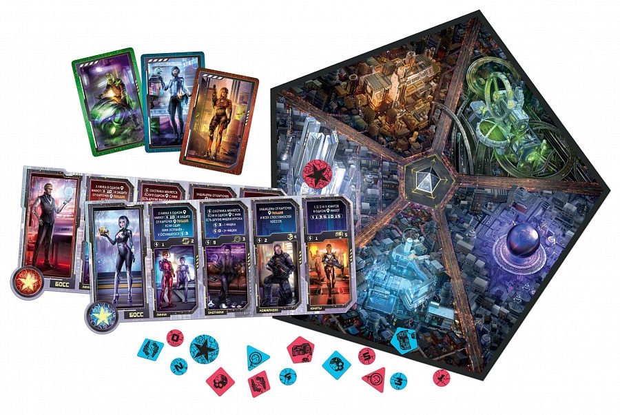 "Ультиматум Синдиката" - дуэльная игра на контроль территорий в мире киберпанка. Город "Гелиос" состоит из пяти районов. Цель каждого игрока – за два раунда взять под контроль больше районов, чем соперник. Для этого вам пригодятся различные наёмники и смелые тактические решения.