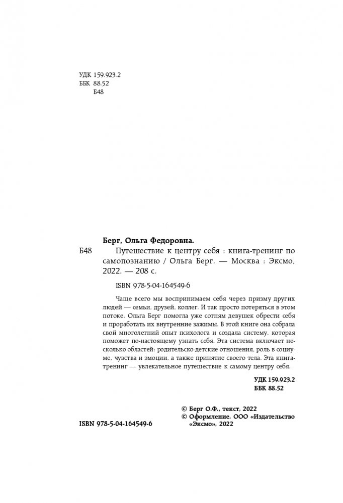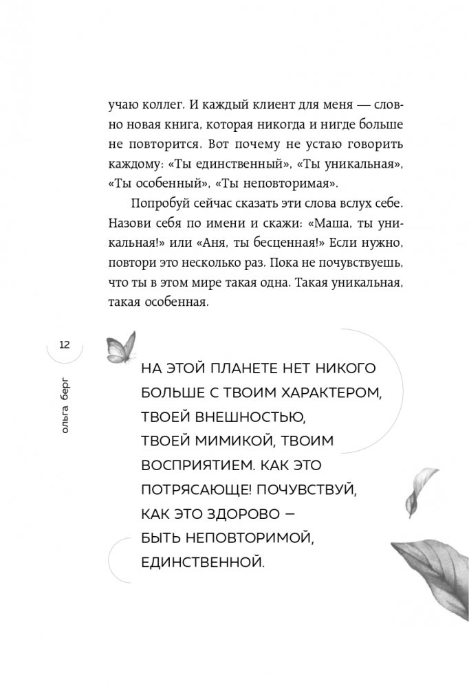 Чаще всего мы воспринимаем себя через призму других людей – семьи, друзей, коллег. И так просто потеряться в этом потоке. Ольга Берг помогла уже сотням девушек обрести себя и проработать их внутренние зажимы. В этой книге она собрала свой многолетний опыт психолога и создала систему, которая поможет по-настоящему узнать себя. Эта система включает несколько областей: родительско-детские отношения, роль в социуме, чувства и эмоции, а также принятие своего тела. Эта книга-тренинг – увлекательное путешествие к самому центру себя.