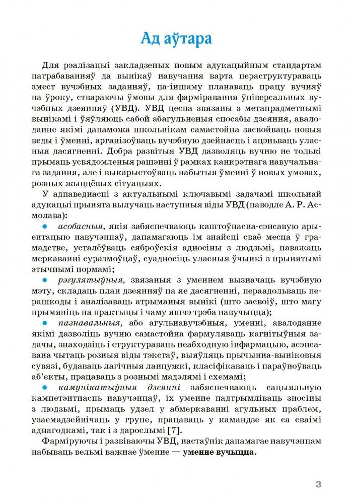 У дапаможніку прапануюцца заданні, распрацаваныя з улікам патрабаванняў вучэбнай праграмы, якія дапамогуць навучэнцам авалодаць універсальнымі навучальнымі дзеяннямі: ставіць вучэбную мэту, знаходзіць патрэбную інфармацыю, прымяняць веды ў новых умовах, кантраляваць і ацэньваць свае дасягненні. Заданні можна выкарыстоўваць на ўроках, факультатыўных і стымулюючых занятках.