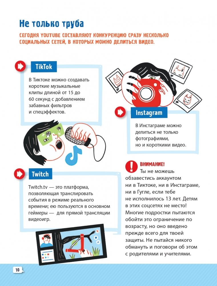 Руководство для будущих криэйторов Самый настоящий учебник для ребят обоих полов (от 9-10 лет и выше), в котором рассказывается не только о том, как открыть канал в YouTube и создавать видео, но и том, как устроен интернет и как вести себя в сети, чтобы этот опыт был безопасным и незабываемым.