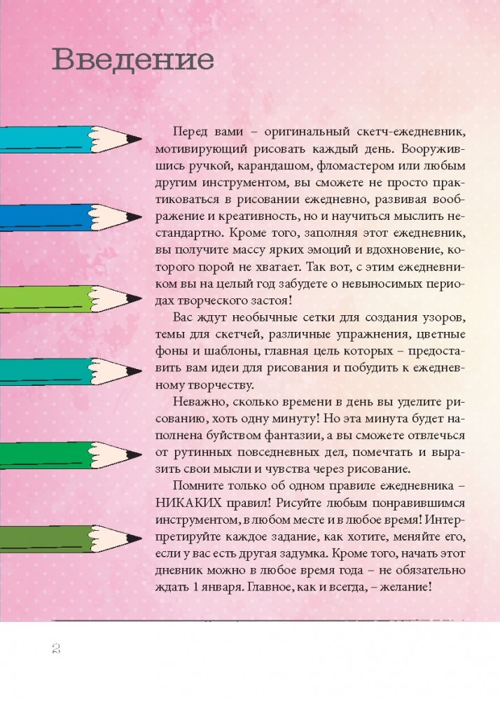 «Рисуй всегда, рисуй везде!» – таков девиз этого скетчбука, который ежедневно будет дарить вам новую идею для рисования!