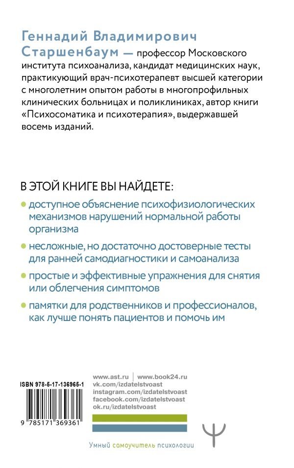 "Все болезни от нервов" — это отнюдь не преувеличение, множество телесных недугов развиваются именно на нервной почве. И чтобы избавиться от них, нужно научиться понимать язык своего тела. Автор книги, известный психотерапевт Г.В. Старшенбаум, много лет проработал в многопрофильных больницах и поликлиниках и в совершенстве овладел этим языком. В этой книге описываются признаки и течение психосоматических расстройств, их диагностика и психотерапия. Приводятся несложные тесты для ранней диагностики, простые, но доказавшие на практике свою эффективность упражнения для снятия или облегчения симптомов. Книга снабжена памятками для больных и их родственников, а также словарем терминов. Книга будет полезна обучающимся и практикующим врачам и психологам, а также всем, кто заинтересован в улучшении собственного самочувствия, здоровья детей и близких.