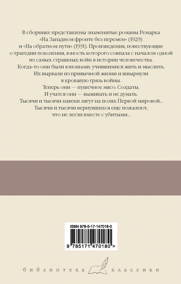В сборнике представлены знаменитые романы Ремарка "На Западном фронте без перемен" (1929) и "На обратном пути" (1931). Произведения, повествующие о трагедии поколения, юность которого совпала с началом одной из самых страшных войн в истории человечества.