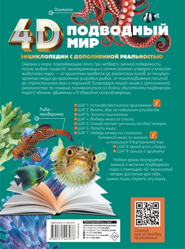 Эта 4D-энциклопедия с дополненной реальностью расскажет о таинственном и загадочном подводном царстве — месте, где когда-то зародилась жизнь. В наши дни океанские глубины изучены лишь на 5%, но и этого достаточно, чтобы познакомиться с его самыми красивыми и ужасающими, стремительными и медлительными, гигантскими и крошечными, смышлеными и не очень обитателями. 4D-анимации оживят на страницах книги и опасную акулу, и ловкого марлина, и крошечного морского конька, и прозрачную медузу. Каждая "живая" картинка сопровождается звукозаписью с познавательной и интересной информацией. Открой эту энциклопедию и узнай все об удивительных жителях подводного мира.