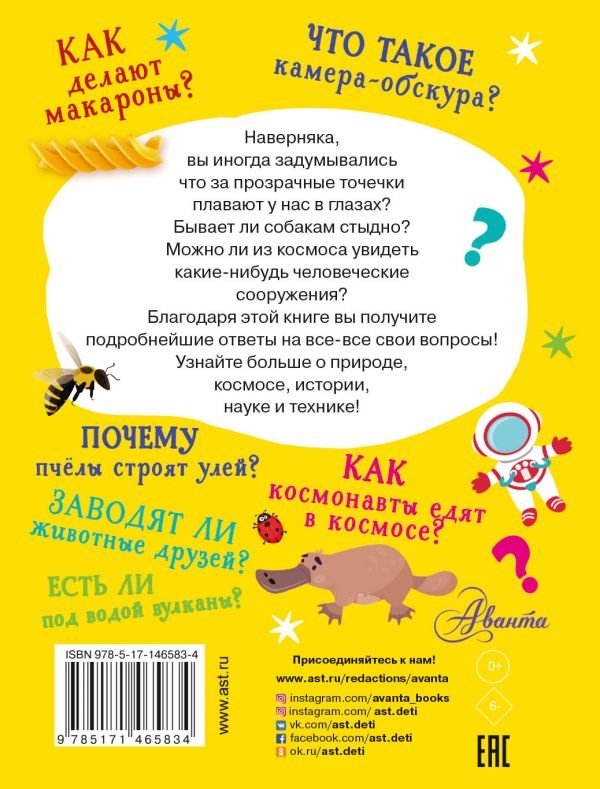 Открыв эту книгу, вы получите ответы на все ваши вопросы об окружающем мире. Почему вода в океанах такая солёная? Каким был первый торт? Почему у людей всего два глаза? Книга сделана в формате один вопрос и ответ на страницу, благодаря чему информация усваивается легко и просто. Вы узнаете много нового о физике, биологии, химии, истории, астрономии и даже сможете рассказать своим друзьям, кто и когда придумал первое мороженое.