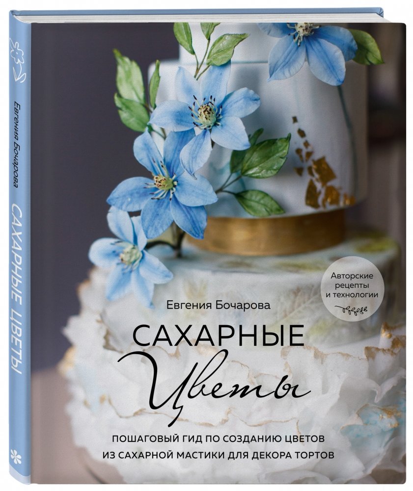 Хрупкие лилии, нежные пионы, яркие розы, трепетные магнолии и обворожительные анемоны застыли как живые. Сахарная флористика позволяет выполнить необыкновенные композиции для украшения тортов от самых простых цветов до экзотических букетов. Безусловно, создание цветочных композиций из сахарной мастики, вафельной бумаги или шоколада — дело не простое и самостоятельно получить достойный результат сложно, тут вам обязательно нужно экспертное мнение человека, который собрал воедино базу, подробный разбор инструментария, приемы и техники, основы работы с красителями, схемы окрашивания и свой многолетний опыт в вопросе. Все эти моменты вы откроете для себя в дебютной книги Евгении Бочаровой, которая с самых азов научит вас творить дивные украшения для тортов и расскажет, как создать цветочное настроение вашему празднику.