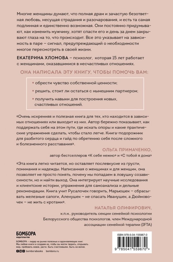 «Любить и быть любимым — одна из базовых человеческих потребностей. Однако некоторым людям любовь приносит страдания и разочарования. Почему же мы остаемся в отношениях, в которых нам плохо? Почему из всех людей выбираем самого сложного? Почему так сильно вкладываемся в близость и так мало получаем взамен? Ответы на эти вопросы дает Екатерина Хломова. Шаг за шагом автор проводит читателя по лабиринтам зависимостей, на многочисленных примерах разъясняя, что такое эмоциональная зависимость и чем она отличается от любви». — Инна Хамитова, семейный психолог, директор Центра Системной Семейной Терапии