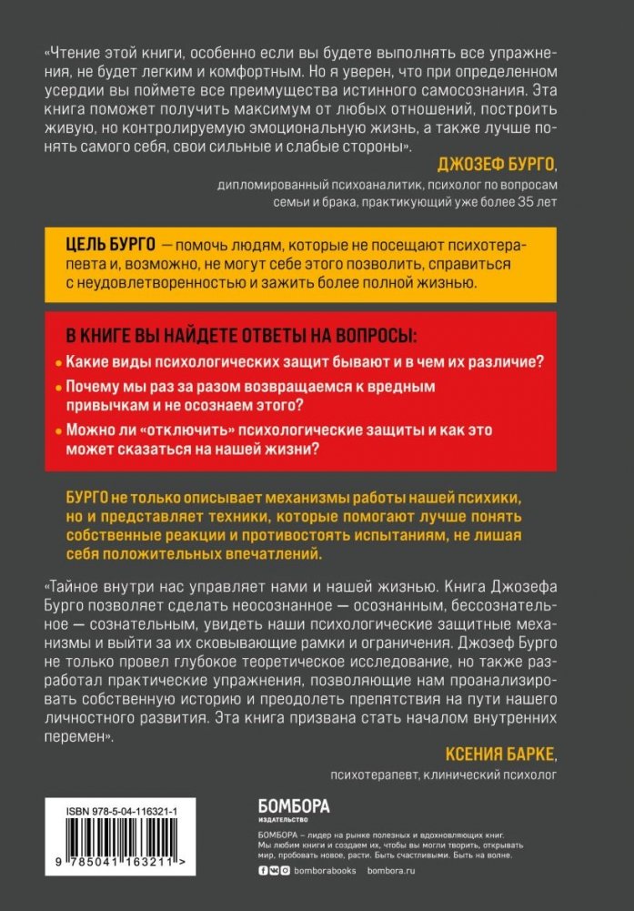 «Чтение этой книги, особенно если вы будете выполнять все упражнения, не будет легким и комфортным. Но я уверен, что при определенном усердии вы поймете все преимущества истинного самосознания. Эта книга поможет получить максимум от любых отношений, построить живую, но контролируемую эмоциональную жизнь, а также лучше понять самого себя, свои сильные и слабые стороны». — Джозеф Бурго, психоаналитик, психолог по вопросам семьи и брака, практикующий уже более 35 лет
