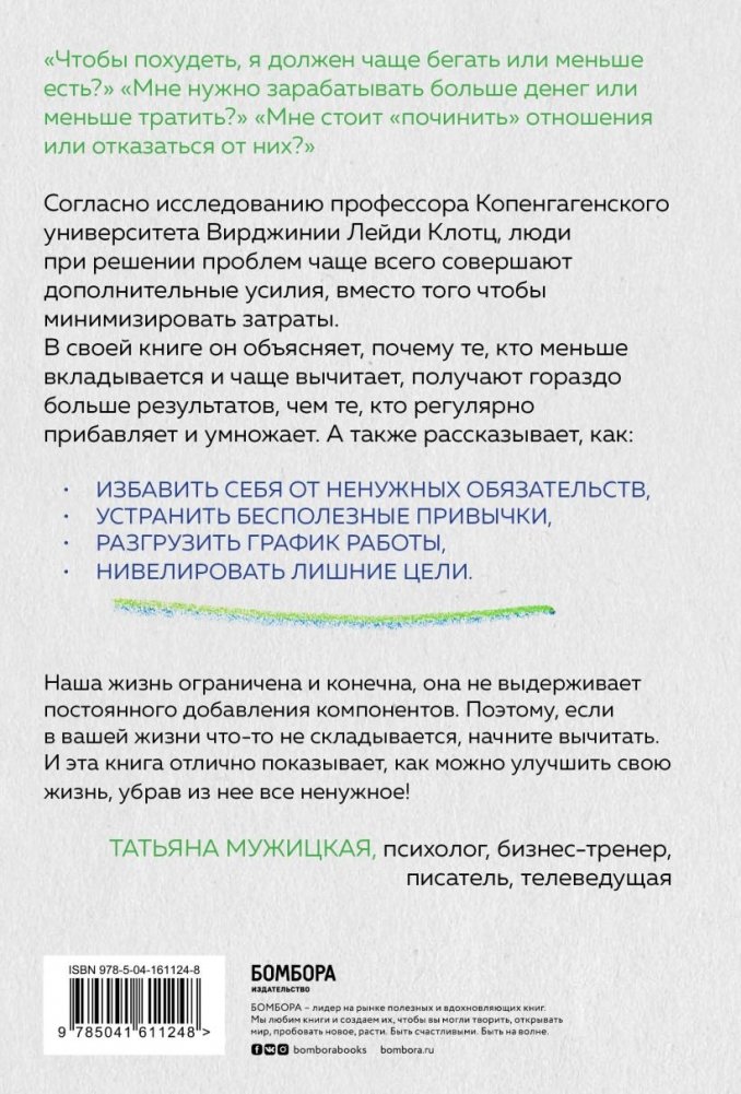 "Когда в жизни что-то идет не так, начните вычитать", – считает профессор Копенгаверского университета Вирджинии Лейди Клоц. В своей кгиге он рассказывает о новаторском подходе к лайф менеджменту, который подразумевает "избавление" от ненужных обязательств, вещей, мнений или привычек. А также предалагет конкретные техники "вычитания", которые упростят этот процесс.