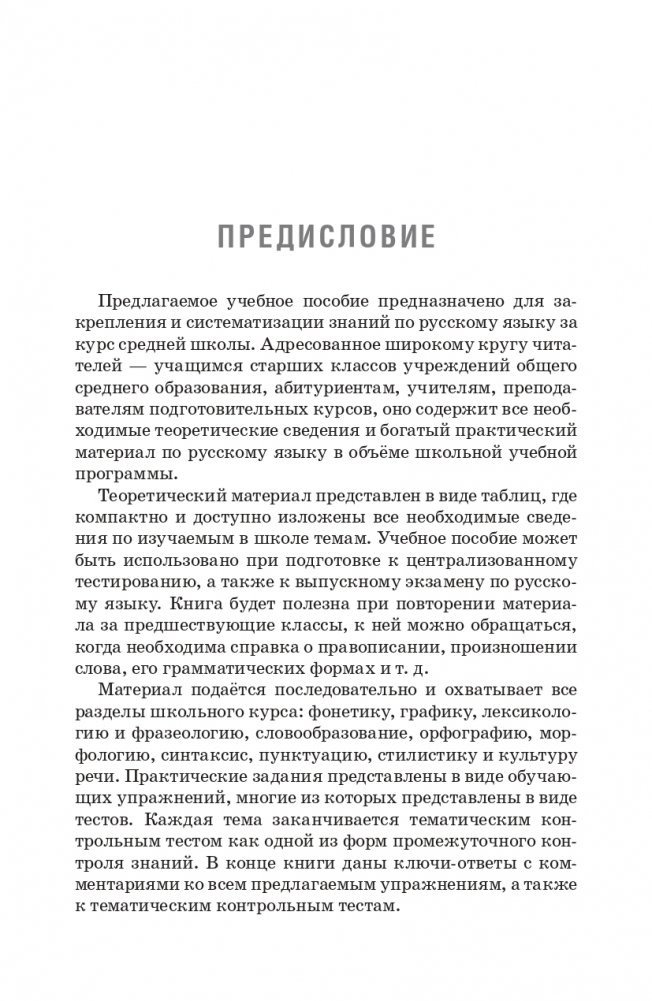Пособие предназначено для закрепления и систематизации знаний по русскому языку за курс средней школы. Оно адресовано учащимся старших классов, абитуриентам, учителям, преподавателям подготовительных курсов, содержит все необходимые теоретические сведения и богатый практический материал по русскому языку в объеме школьной учебной программы. Теоретический материал представлен в виде таблиц, где компактно и доступно изложены все необходимые сведения по изучаемым в школе темам. Учебное пособие может быть использовано при подготовке к тестированию, к выпускному или вступительному экзамену по русскому языку, а также при повторении материала за предшествующие классы. Практические задания приводятся в виде обучающих упражнений, в том числе и тестов. Каждая тема заканчивается тематическим контрольным тестом. В конце книги даны ключи-ответы с комментариями ко всем предлагаемым упражнениям и тестам.