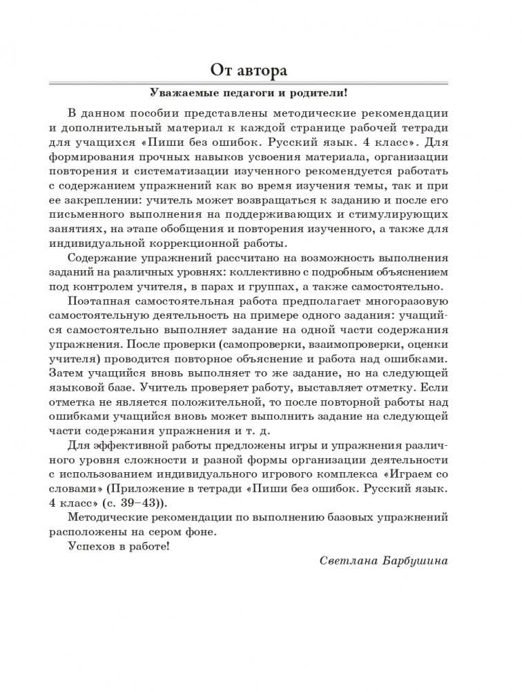 Пособие является частью учебно-методического комплекса «Школа доктора Грамотея». Адресуется учителям, родителям и содержит подробные методические рекомендации, игры и дополнительные упражнения к рабочей тетради «Пиши без ошибок. Русский язык. 4 класс». Они помогут вам в формировании у детей орфографических умений и прочных навыков усвоения изученного материала.