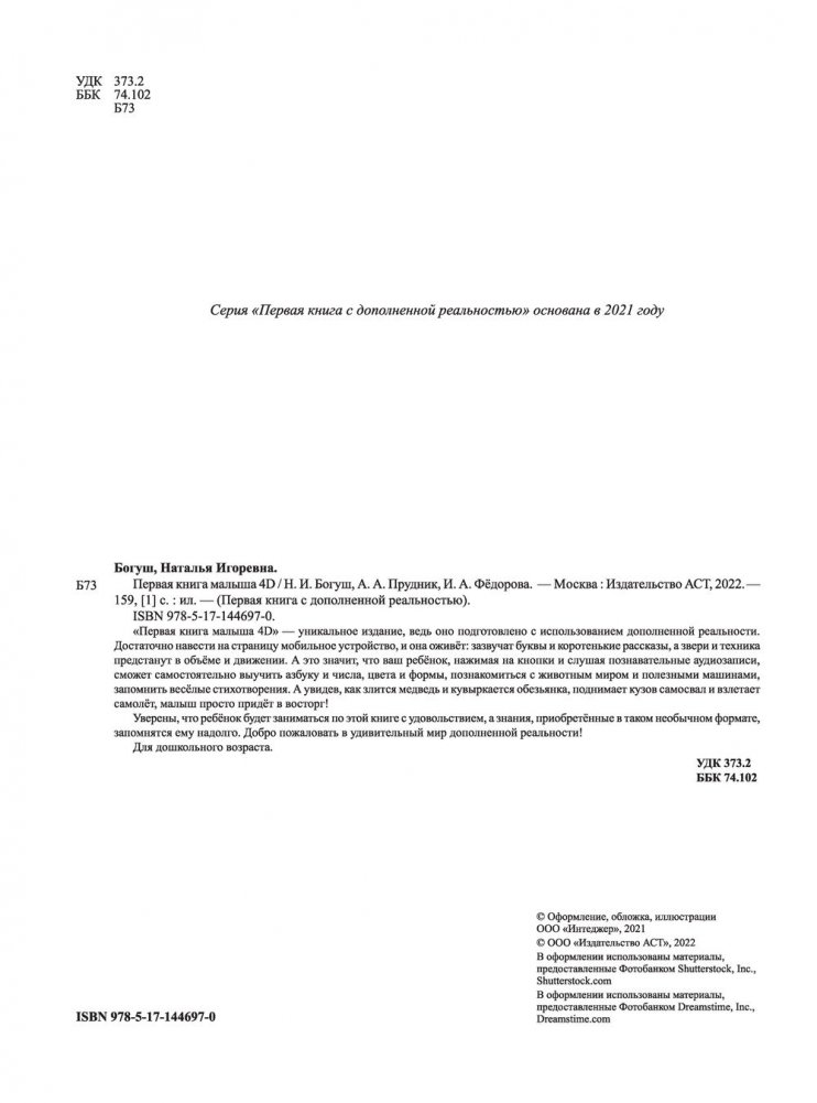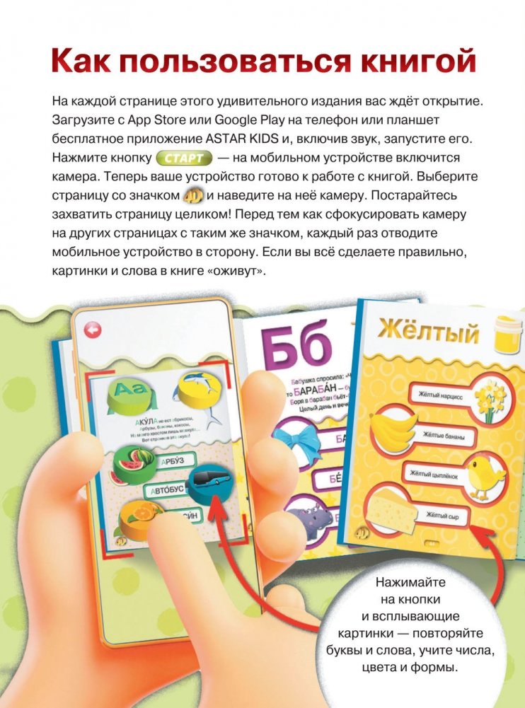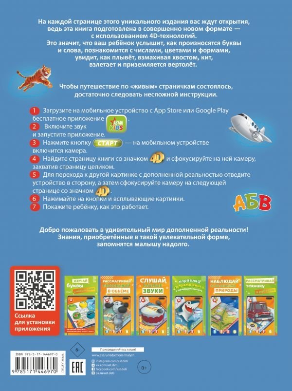 «Первая книга малыша 4D» — уникальное издание, ведь оно подготовлено с использованием дополненной реальности. Достаточно навести на страницу мобильное устройство, и она оживёт: зазвучат буквы и коротенькие рассказы, начнут двигаться звери и машинки. А это значит, что ваш ребёнок сможет заниматься по ней самостоятельно. Нажимая на кнопки и слушая познавательные аудиозаписи, малыш выучит буквы и слова, числа, цвета и формы, познакомится с животным миром и полезными машинами, запомнит весёлые стихотворения.