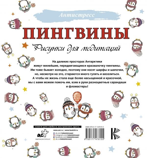 На далеких просторах Антарктики живут милейшие, передвигающиеся вразвалочку пингвины. Им тоже бывает холодно, поэтому они носят шарфы и шапочки, но, несмотря на это, стараются много гулять и веселиться. А чтобы их жизнь стала еще более насыщенной и красочной, мы с вами можем помочь им, взяв в руки разноцветные карандаши и фломастеры!