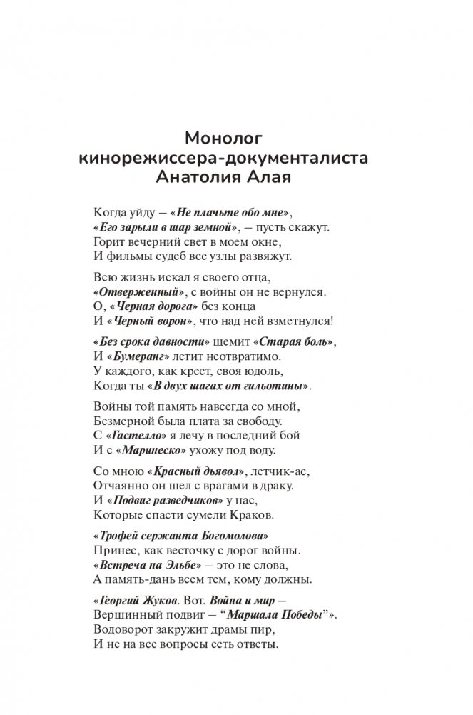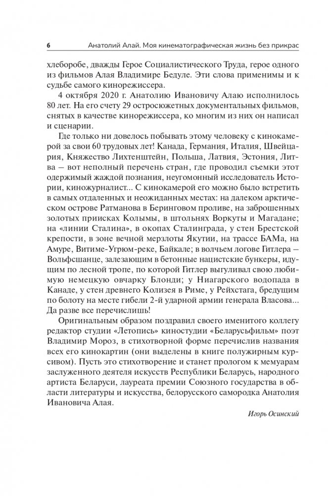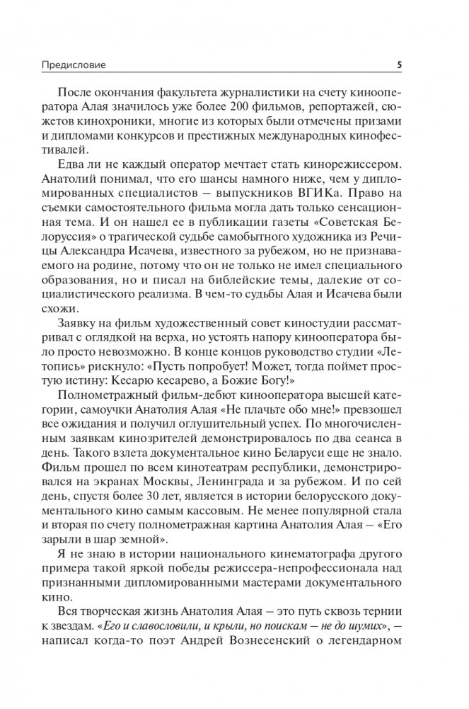 Кинооператор и кинорежиссер высшей категории, «Отличник кинематографии СССР», член Белорусского союза кинематографистов, член Географического общества СССР, заслуженный деятель искусств Республики Беларусь, народный артист Беларуси, лауреат литературной премии имени Алеся Адамовича, приза Романа Кармена, премии Союзного государства в области литературы и искусства Анатолий Алай рассказывает о том, как создавались его остросюжетные фильмы, размышляет о творчестве оператора и кинорежиссера и о непростой судьбе национального документального кино, представлена личная оценка событий и фактов.