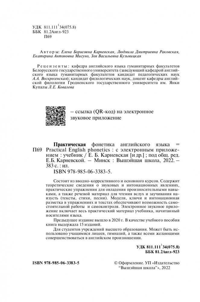 Состоит из вводно-коррективного и основного курсов. Содержит теоретические сведения о звуковых и интонационных явлениях, практические упражнения для овладения произносительными навыками, а также речевой материал для чтения вслух и заучивания наизусть (тексты, стихи, песни). Модели, ключи и интонационная разметка в упражнениях и текстах обеспечивают возможность самостоятельной работы и самоконтроля. Электронное звуковое приложение включает весь практический материал учебника, начитанный носителями языка.
