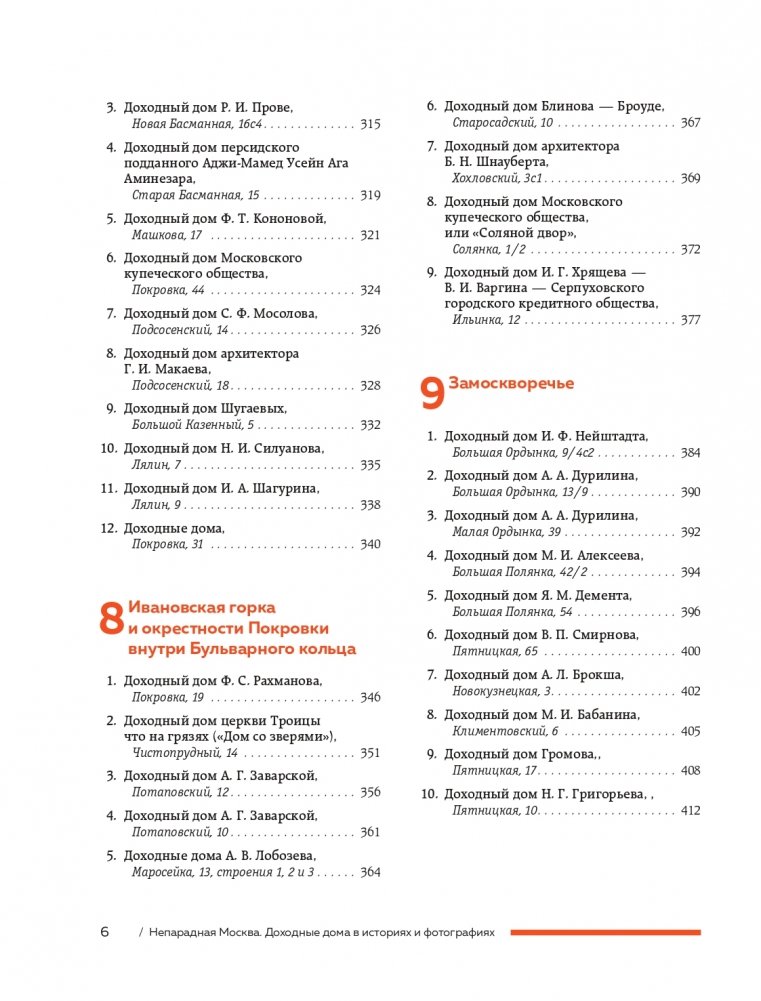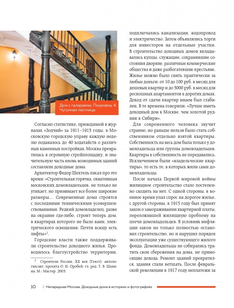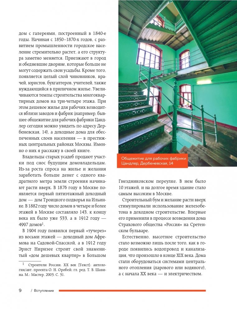 Вместе с автором вы «прогуляетесь» по доходным домам Москвы: от Арбата до Патриарших прудов, от Пречистенки до Остоженки, от Тверской до Мясницкой, «заглянете» в переулки Замоскворечья и «побываете» во дворах Бульварного кольца.