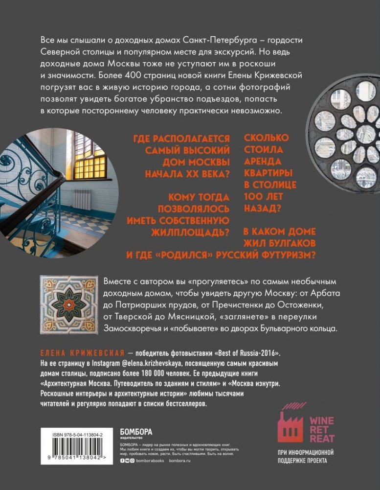 Елена Крижевская — победитель фотовыставки «Best of Russia-2016». На ее страницу в Instagram @elena.krizhevskaya, посвященную самым красивым домам столицы, подписано более 180 000 человек. Ее предыдущие книги «Архитектурная Москва. Путеводитель по зданиям и стилям» и «Москва изнутри. Роскошные интерьеры и архитектурные истории» любимы тысячами читателей и регулярно попадают в списки бестселлеров.