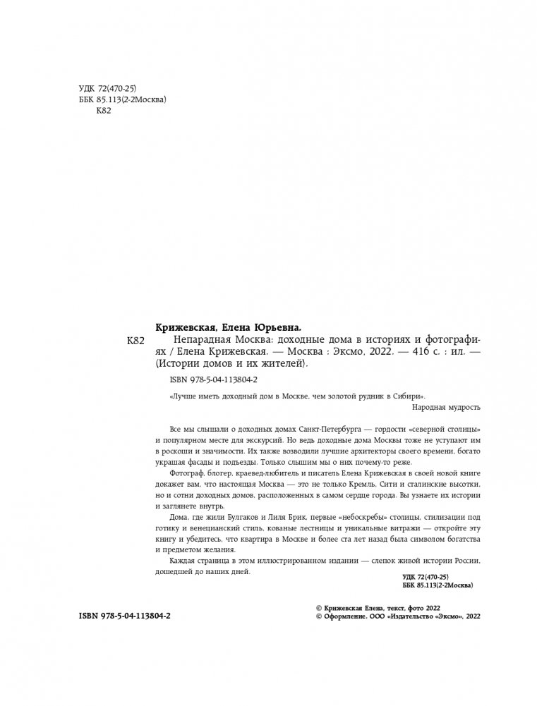 Фотограф, блогер, краевед-любитель и писатель Елена Крижевская в своей новой книге докажет вам, что настоящая Москва — это не только Кремль, Сити и сталинские высотки, но и сотни доходных домов, расположенных в самом сердце города. Вы узнаете их истории и заглянете внутрь.
