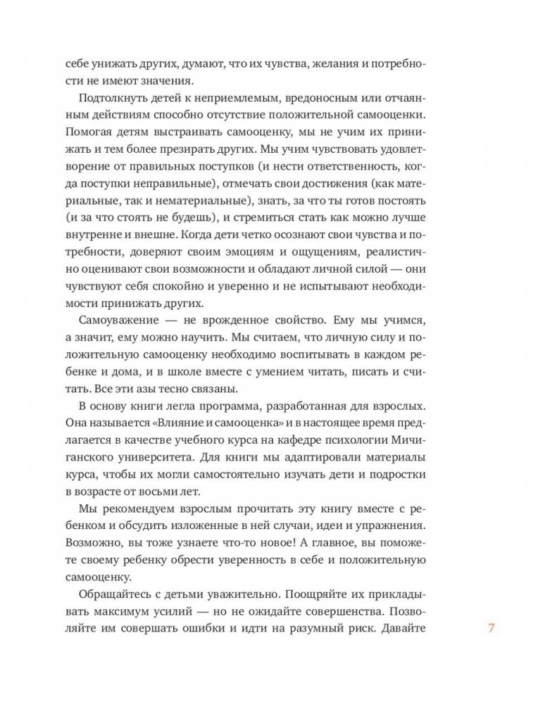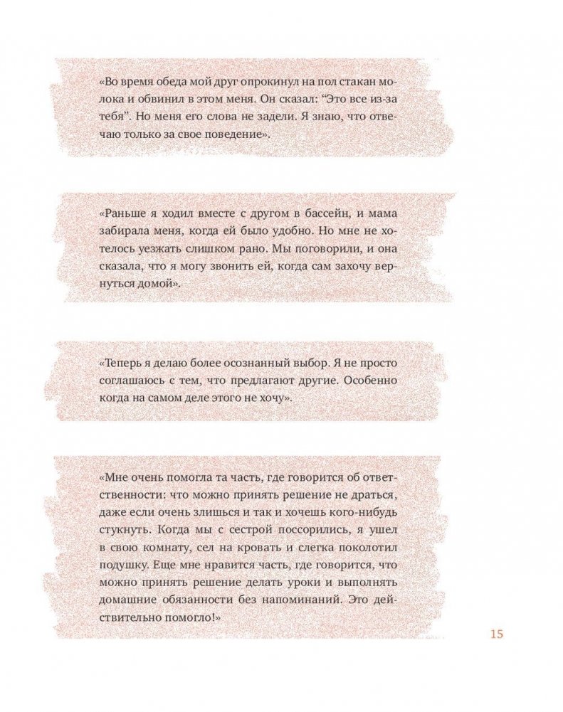 Подростки, уважающие себя, внутренне спокойны, готовы отвечать за свои действия, способны справляться с жизненными неурядицами и философски переносят отказы, разочарования, неудачи и поражения. Книга учит детей уважать себя, осознавать свои чувства и потребности и принимать на себя ответственность за свою жизнь.
