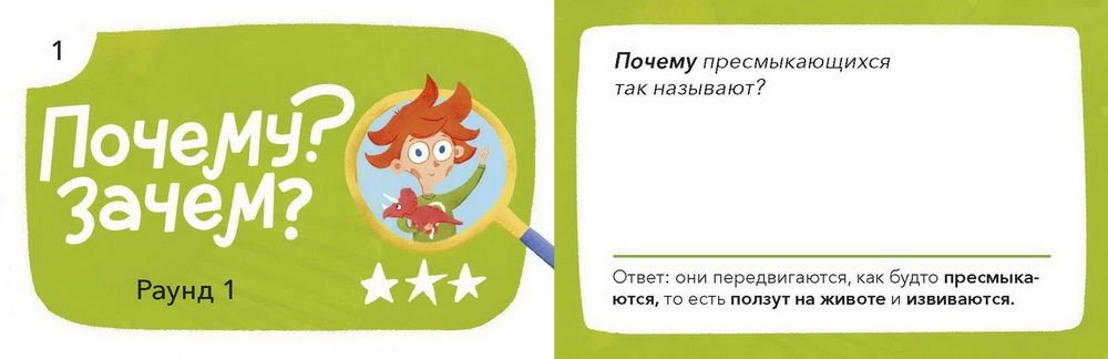 В ней два раунда, и в свой ход нужно выбрать одну из карт, зная только тип вопроса и его сложность. Не уверен, что ответил правильно? Не переживай, на каждой карточке есть ответ. А ещё дядя Кузя написал палеонтологический дневник, где собрал более подробные ответы на вопросы и самые интересные факты о динозаврах и пресмыкающихся.