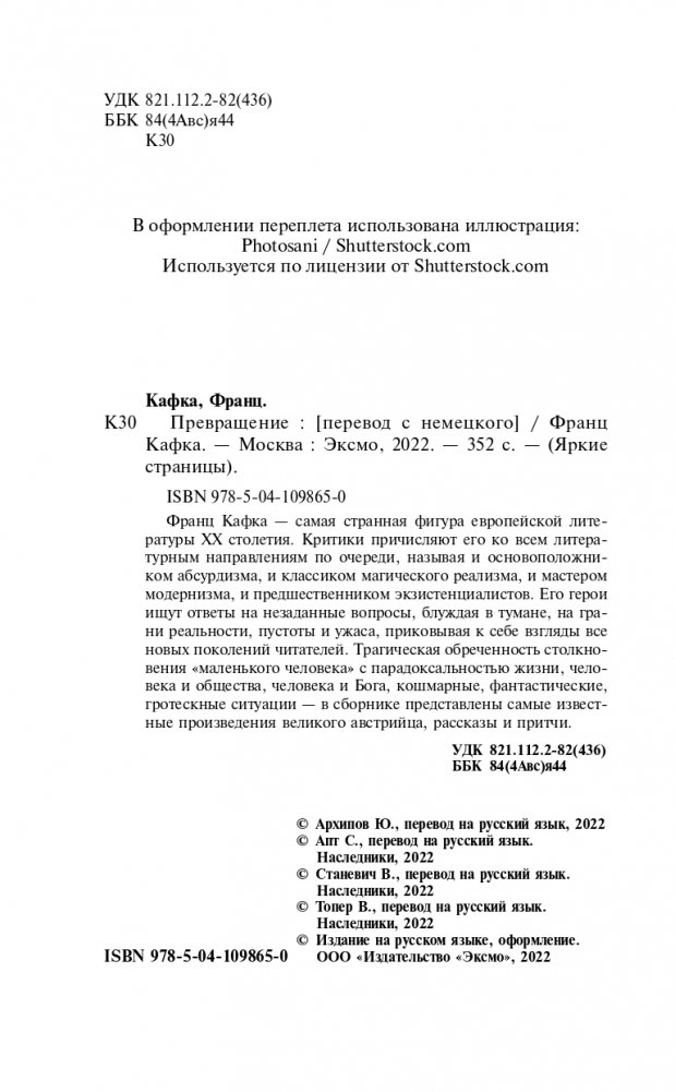 Франц Кафка — самая странная фигура европейской литературы ХХ столетия. Критики причисляют его ко всем литературным направлениям по очереди, называя и основоположником абсурдизма, и классиком магического реализма, и мастером модернизма, и предшественником экзистенциалистов. Его герои ищут ответы на незаданные вопросы, блуждая в тумане, на грани реальности, пустоты и ужаса, приковывая к себе взгляды все новых поколений читателей. Трагическая обреченность столкновения "маленького" человека с парадоксальностью жизни, человека и общества, человека и Бога, кошмарные, фантастические, гротескные ситуации — в сборнике представлены самые известные произведения великого австрийца, рассказы и притчи.