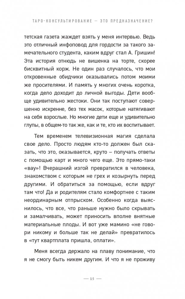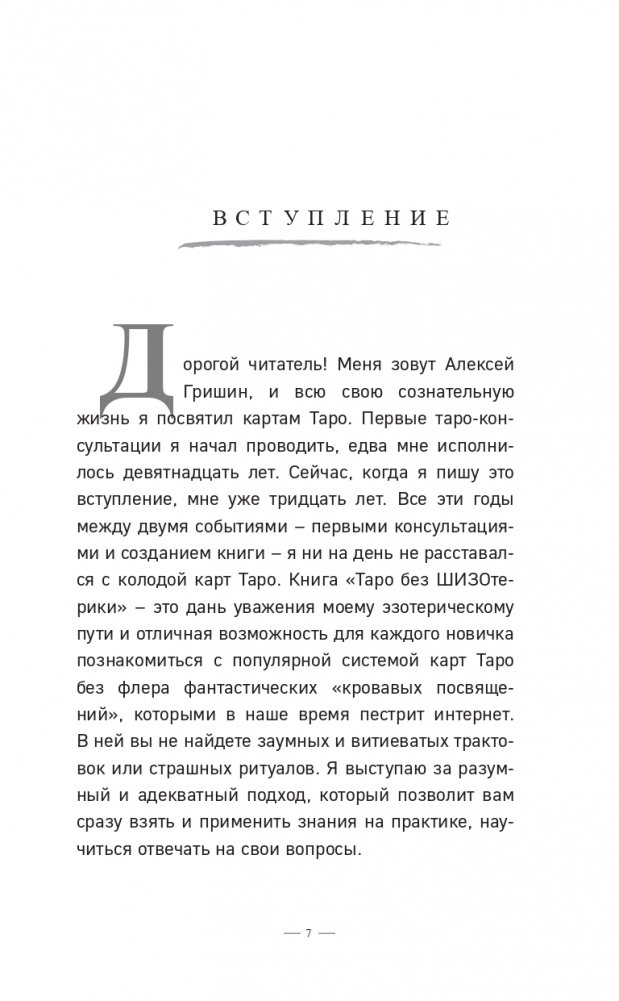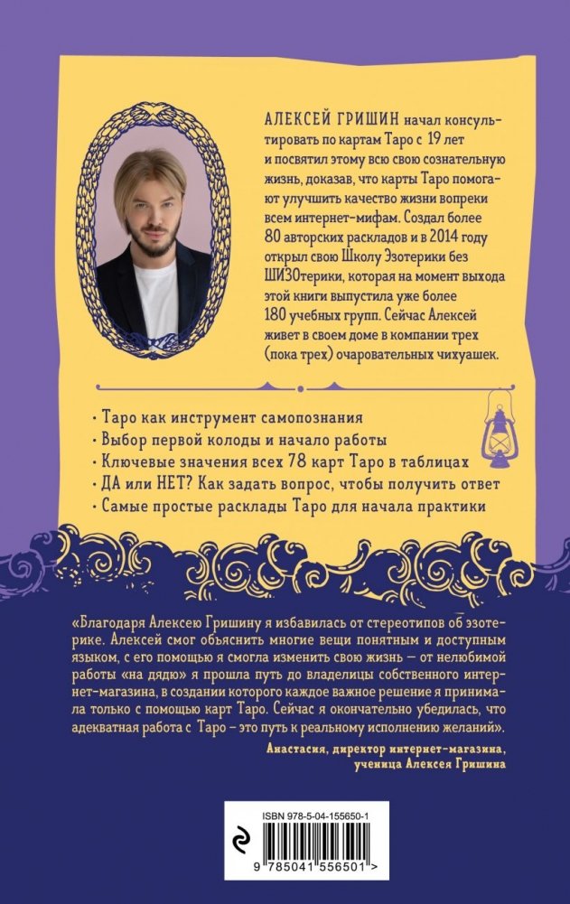 Алексей Гришин начал консультировать по картам Таро с 19 лет и посвятил этому всю свою сознательную жизнь, доказав, что карты Таро помогают улучшить качество жизни, вопреки всем интернет-мифам. Создал более 80 авторских Раскладов и в 2014 году открыл свою Школу Эзотерики без ШИЗОтерики, которая на момент выхода этой книги выпустила уже более 180 учебных групп. Сейчас Алексей живет в своем доме в компании трех (пока трех) очаровательных чихуашек.
