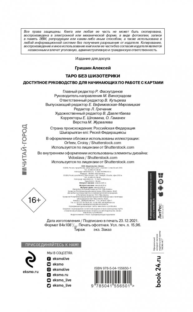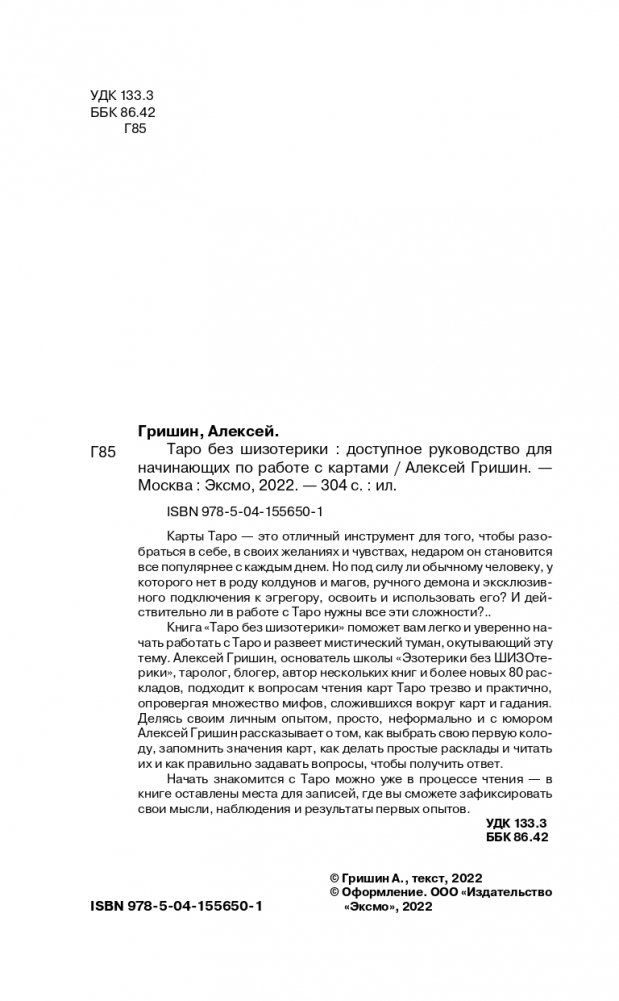 Книга «Таро без шизотерики» поможет вам легко и уверенно начать работать с картами Таро и развеет мистический туман, окутывающий эту тему. Алексей Гришин, основатель школы «Эзотерики без ШИЗОтерики», таролог, блогер, автор нескольких книг, подходит к вопросу чтения карт Таро трезво и практично, опровергая множество мифов, сложившихся вокруг карт и гадания, и делится своим опытом — просто, неформально и с юмором.