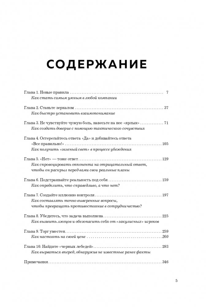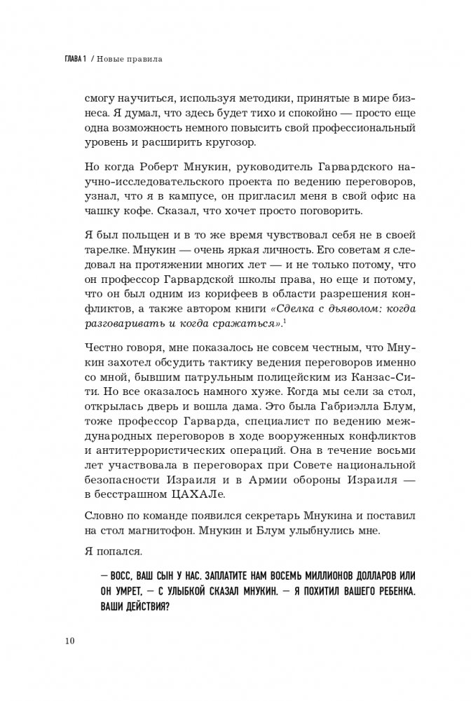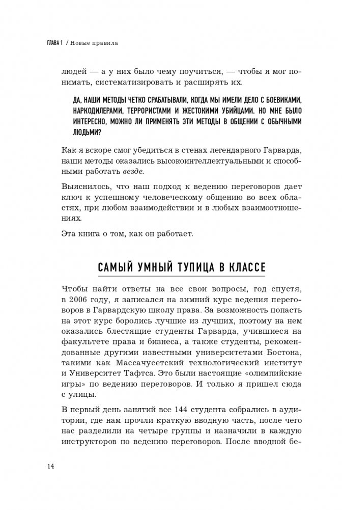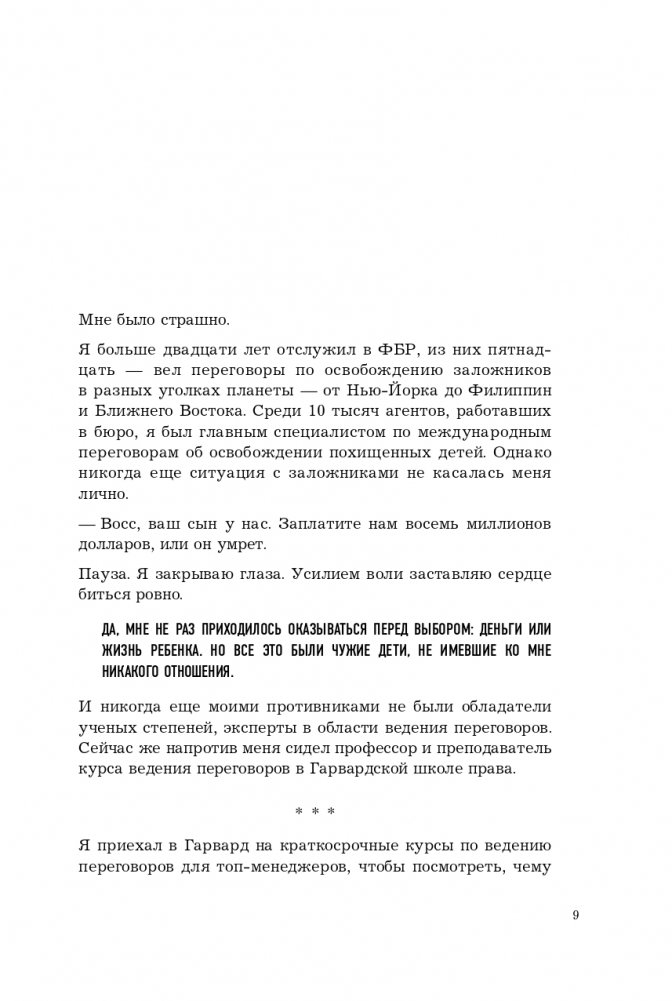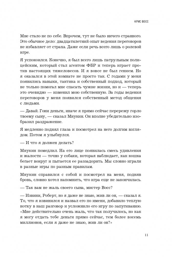 «Я не вижу особой разницы между террористом, взявшим в заложники людей, и агентом по недвижимости, который отчаянно пытается сбить цену на ваш дом», — утверждает Крис Восс на страницах своей книги. Те приемы, которые срабатывают в переговорах с первым, точно так же срабатывают и со вторым. Разница только одна: когда спасаешь заложников, не имеешь права останавливаться на полпути — соглашаться на освобождение, скажем, семи человек из десяти и гибель остальных. Ты должен всегда идти до конца. Добиваться абсолютной победы при любых раскладах. Книга «Переговоры без компромиссов» именно об этом.