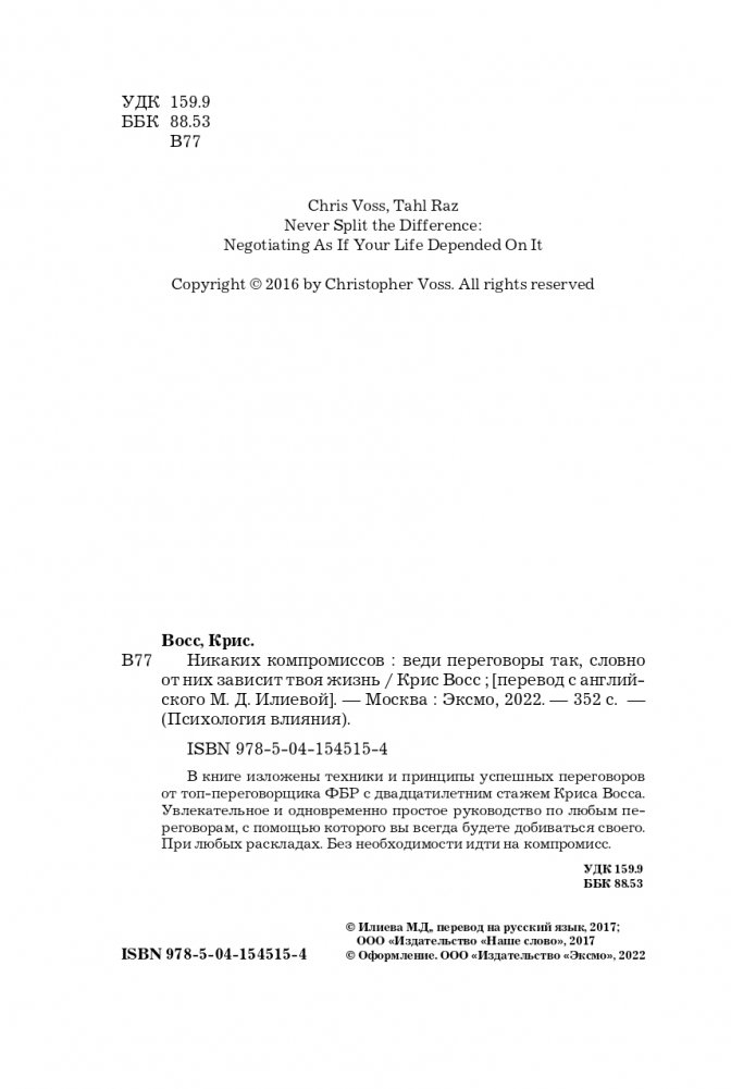 «Книга Крисса Восса обязательна для прочтения тем, кто хочет вести переговоры на серьезном уровне. Вы расширите горизонты и сможете достигать соглашений с теми, кого считали ранее несговорчивыми». — Игорь Рызов, автор бестселлеров «Кремлёвская школа переговоров», «Переговоры с монстрами» и «Психотрюки»