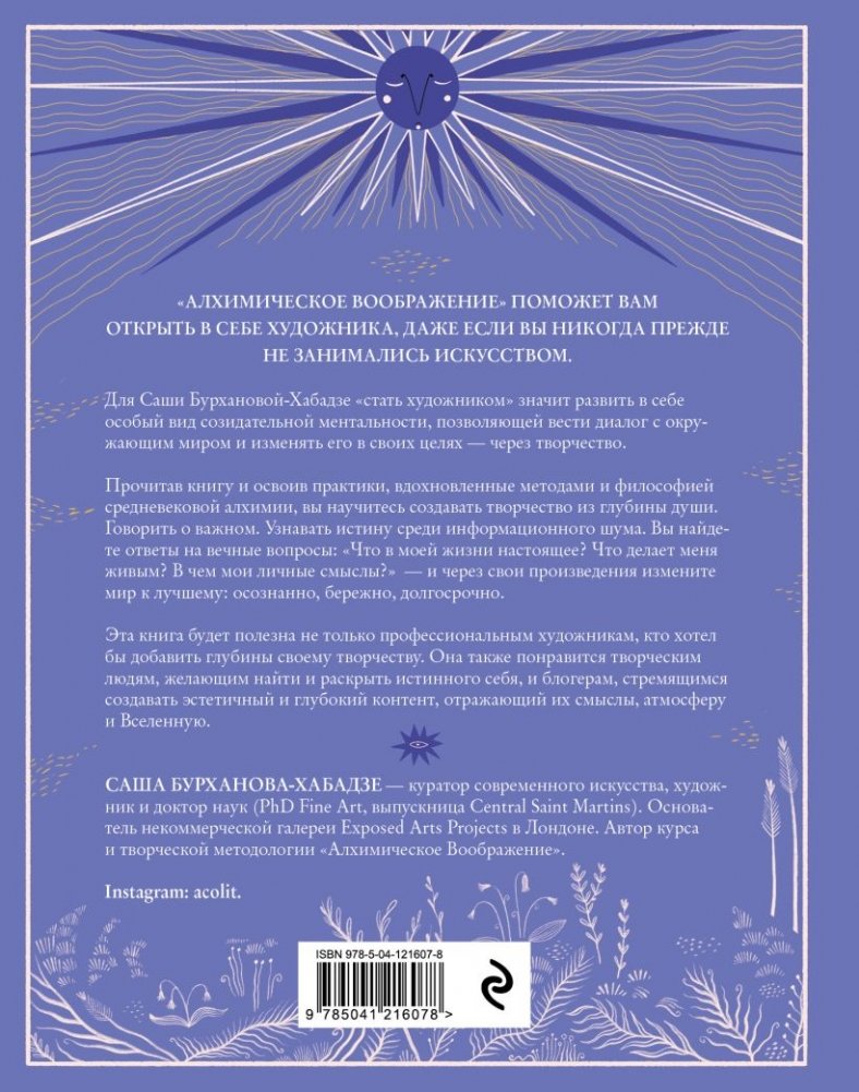 Как рождается творческая мысль? Откуда приходит вдохновение? Что делает произведение живым? Могу ли я создать что-то по- настоящему прекрасное? Эти вопросы волнуют всех, кто сталкивается с самой загадочной стороной творчества. Как профессиональных художников, так и тех, кому интересно найти творческую форму, чтобы показать миру истинного себя. Можно научиться правильно смешивать краски и умело строить линии, но так и не почувствовать восторг свободы созидания. Книга художницы Саши Бурхановой-Хабадзе раскроет секреты творчества из глубины души. В ней описаны практики и методики, которые помогут вашему вдохновению, научат слышать свой внутренний голос и голос Вселенной, научат говорить с окружающим миром через творчество. Эта книга будет интересна всем, кто хочет развить творческую ментальность и найти ключи к своему вдохновению. Практики, основанные на методах и философии средневековой алхимии, современный систематизированный подход и невероятно изящные иллюстрации автора - настоящий подарок для тех, кто мечтает заглянуть в тайну рождения внутреннего художника.