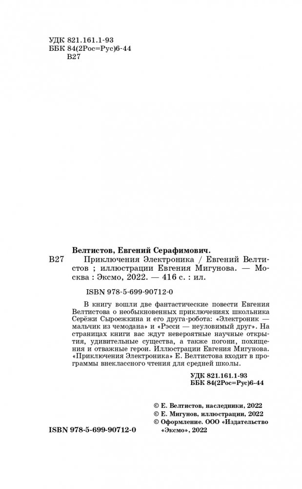 В книгу вошли две фантастических повести Евгения Велтистова о необыкновенных приключениях школьника Серёжи Сыроежкина и его друга-робота: "Электроник – мальчик из чемодана" и "Рэсси – неуловимый друг". На страницах книги вас ждут невероятные научные открытия, удивительные существа, а также погони, похищения и отважные герои. Иллюстрации Евгения Мигунова. "Приключения Электроника" Е. Велтистова входит в программы внеклассного чтения для средней школы.