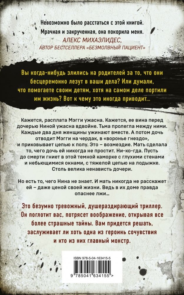 Кажется, расплата Мэгги – ужасна. Кажется, ее вина перед дочерью Ниной – ужасна вдвойне. Тьма пролегла между ними. Каждые два дня женщины ужинают вместе. А потом дочь отводит Мэгги на чердак, в "воронье гнездо", и приковывает цепью к полу. Это – возмездие. Мать сделала то, чего дочь ей никогда не простит. Ни-ко-гда. Пусть до смерти гниет в этой темной каморке с глухими стенами и небьющимися окнами, с тяжелой цепью на лодыжке. Столь велика ненависть дочери.