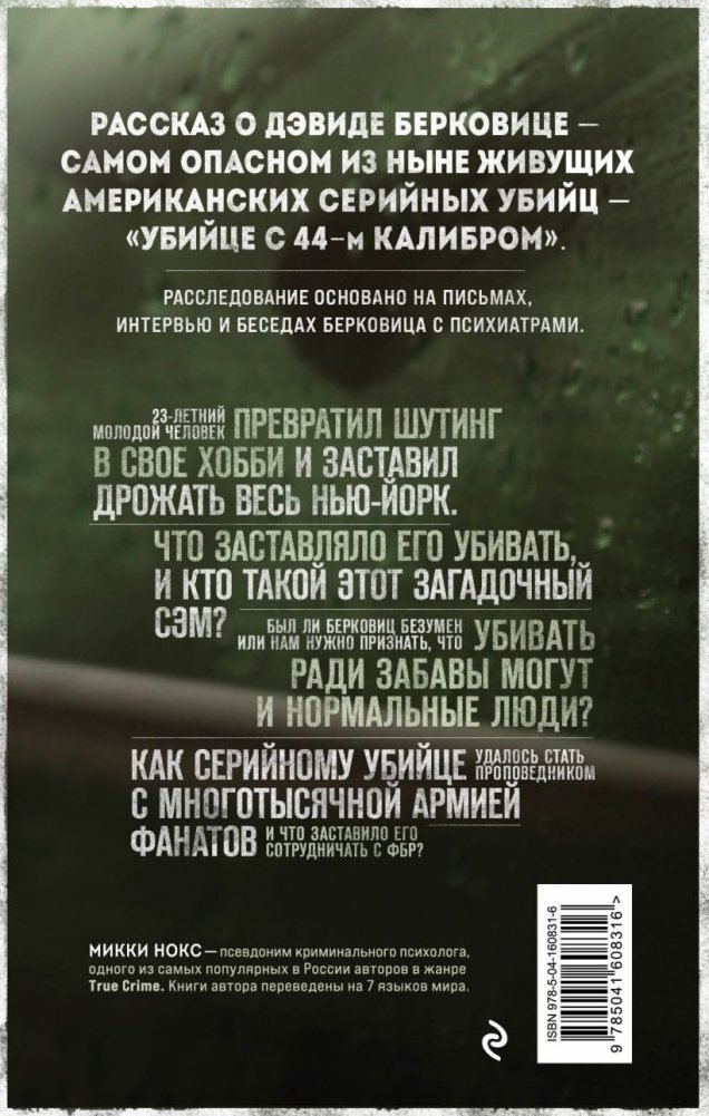 Рассказ о Дэвиде Берковице — самом опасном из ныне живущих американских серийных убийц. Расследование основано на письмах, интервью и беседах Берковица с психиатрами. Автор — Микки Нокс, криминальный психолог, один из самых популярных в России авторов в жанре true crime.