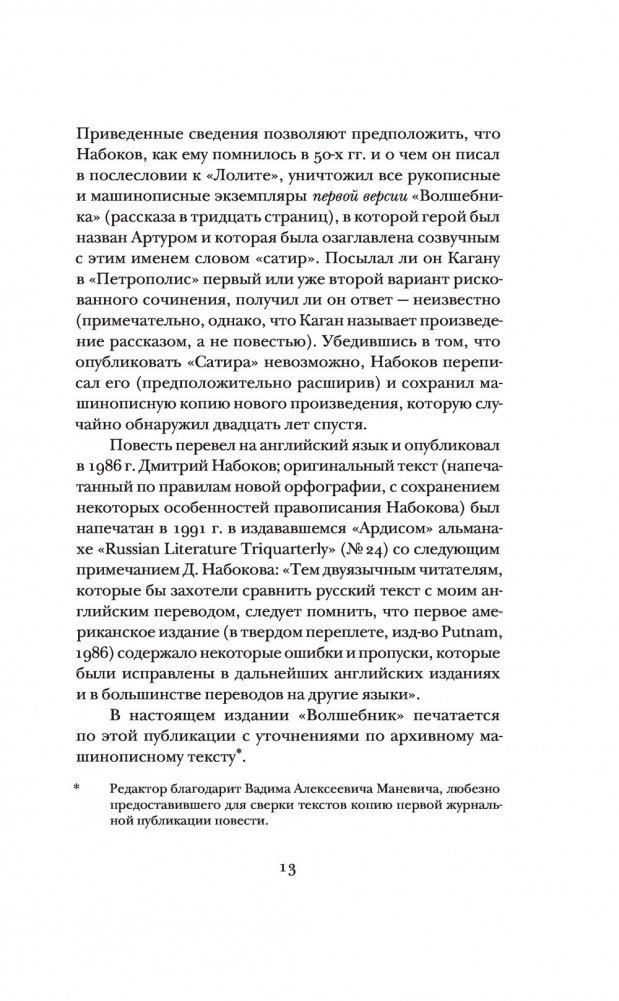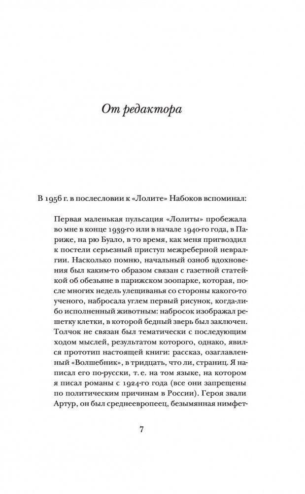 В это издание вошли два произведения Владимира Набокова, написанных в Париже в конце 1930-х – начале 1940-х перед отъездом писателя в Америку. “Волшебник” – повесть, идейно предшествующая созданию романа “Лолита”. В послесловии к изданию 1956-го года Набоков пишет, что ее прототипом был “рассказ, озаглавленный “Волшебник”… Героя звали Артур, он был среднеевропеец, безымянная нимфетка была француженка, и дело происходило в Париже и Провансе. Он у меня женился на больной матери девочки, скоро овдовел и после неудачной попытки приласкаться к сиротке в отельном номере бросился под колеса грузовика.” По воспоминаниям Набокова, он уничтожил рукопись повести, но позже ее единственный экземпляр обнаружился в бумагах писателя. Вторая часть книги – незаконченный роман “Solus Rex”. Набоков написал две первые главы и больше к задуманному не возвращался. Главы, однако, дополняют друг друга и образуют собой композиционное единство. Это две истории, происходящие как бы в параллельных мирах – в реальном и сказочном, где герои и мотивы перекликаются, одно событие неожиданным образом отражается в другом. Набоков создает призрачный, текучий мир, где портрет дельца проглядывает в принце, а в короле мы узнаем художника.