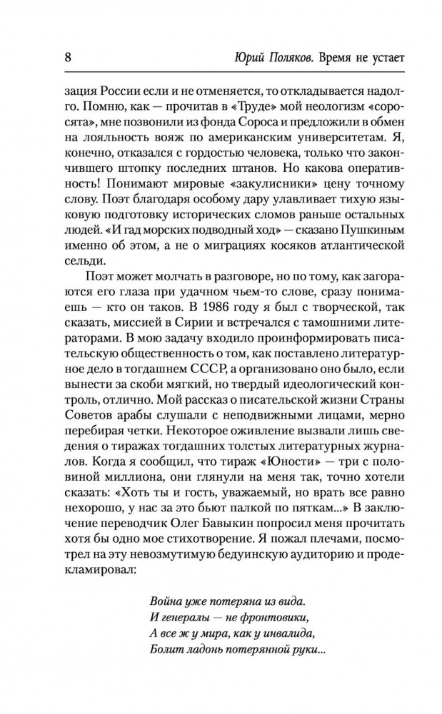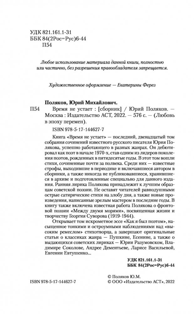 Книга "Время не устает" - последний, двенадцатый том собрания сочинений известного русского писателя Юрия Полякова, успешно работающего в разных жанрах. Он дебютировал как поэт в начале 1970-х, став одним из лидеров поколения поэтов, рожденных в пятидесятые годы. В этот том вошли стихи, сочиненные почти за полвека. Среди них - известные строфы, выходившие в периодике и включавшиеся автором в сборники, а также никогда не публиковавшиеся, хранившиеся в архиве и подготовленные специально для данного издания. Ранняя лирика Полякова принадлежит к лучшим образцам советской поэзии. Не оставят читателей равнодушными острые сатирические стихи на злобу дня, а также новые произведения, написанные зрелым мастером в последние годы. В книгу также включена известная работа Полякова о фронтовой поэзии "Между двумя морями", посвященная жизни и творчеству Георгия Суворова (1919-1944).