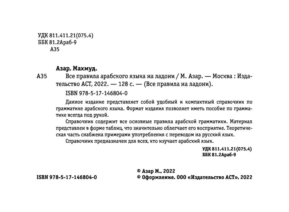 Данное издание представляет собой удобный и компактный справочник по грамматике арабского языка. Формат издания позволяет иметь пособие по грамматике всегда под рукой.