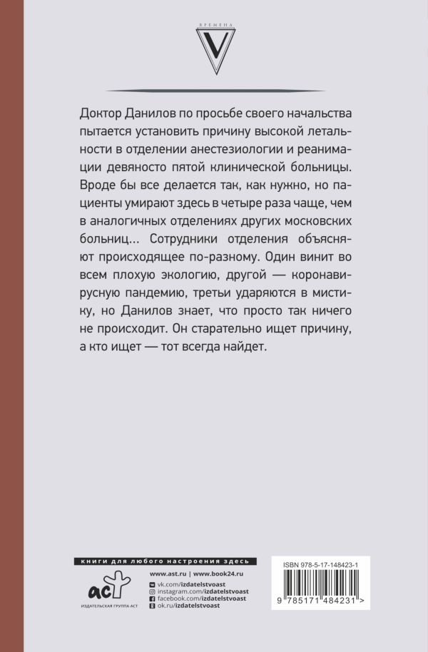 Доктор Данилов по просьбе своего начальства пытается установить причину высокой летальности в отделении анестезиологии и реанимации девяносто пятой клинической больницы. Вроде бы все делается так, как нужно, но пациенты умирают здесь в четыре раза чаще, чем в аналогичных отделениях других московских больниц… Сотрудники отделения объясняют происходящее по-разному. Один винит во всем плохую экологию, другой — коронавирусную пандемию, третьи ударяются в мистику, но Данилов знает, что просто так ничего не происходит. Он старательно ищет причину, а кто ищет — тот всегда найдет. Это не детектив и не медицинский триллер, хотя элементы того и другого присутствуют. Это пятнадцатый роман о приключениях, похождениях и злоключениях доктора Данилова.