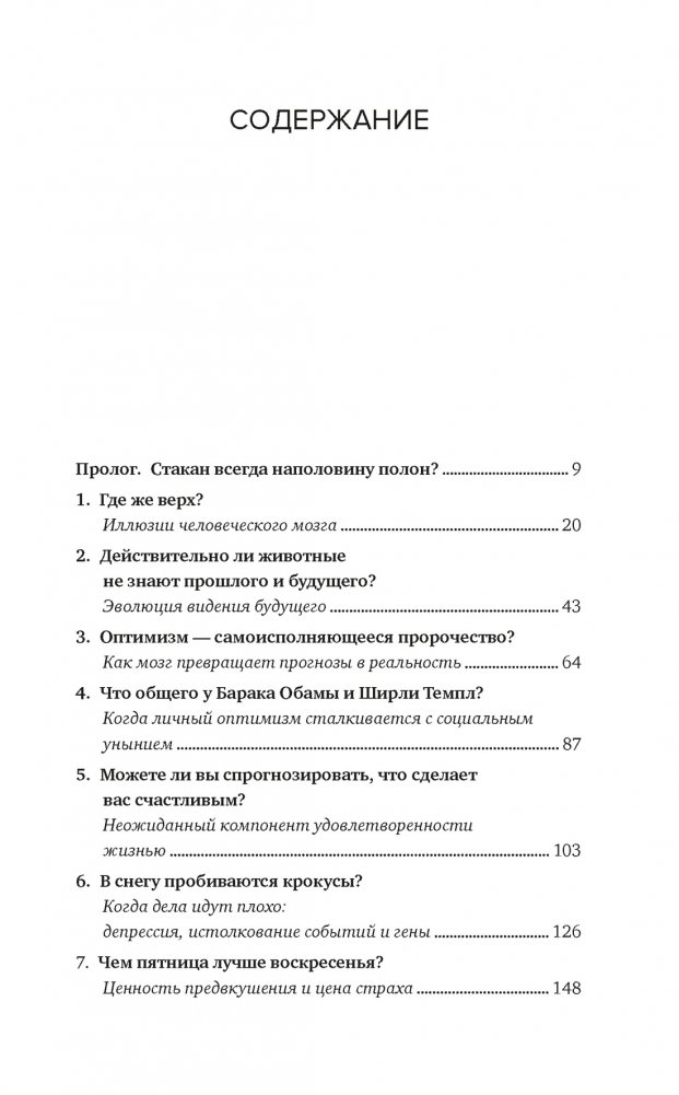 «В этой книге описывается самый большой обман, на который способен человеческий мозг, — склонность к оптимизму. Вы узнаете, когда эта предрасположенность полезна, а когда вредна, и получите доказательства, что умеренно оптимистичные иллюзии могут поддерживать внутреннее благополучие человека. Особое внимание я уделю специальной структуре мозга, которая позволяет необоснованному оптимизму рождаться и влиять на наше восприятие и поведение. Чтобы понять феномен склонности к оптимизму, нам в первую очередь необходимо проследить, как и почему мозг человека создает иллюзии реальности.